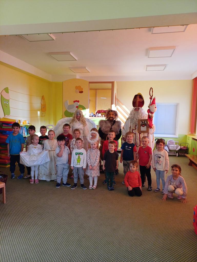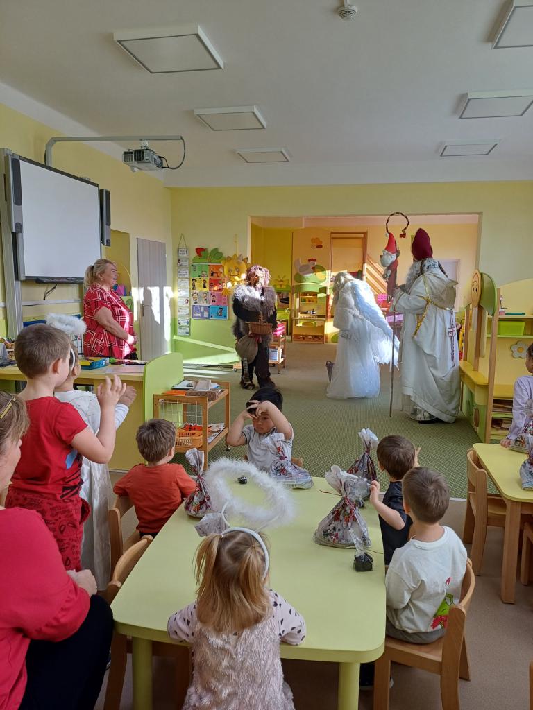 Obdarovávání dětí balíčky plné sladkostí, ovoce a uhlí od čerta